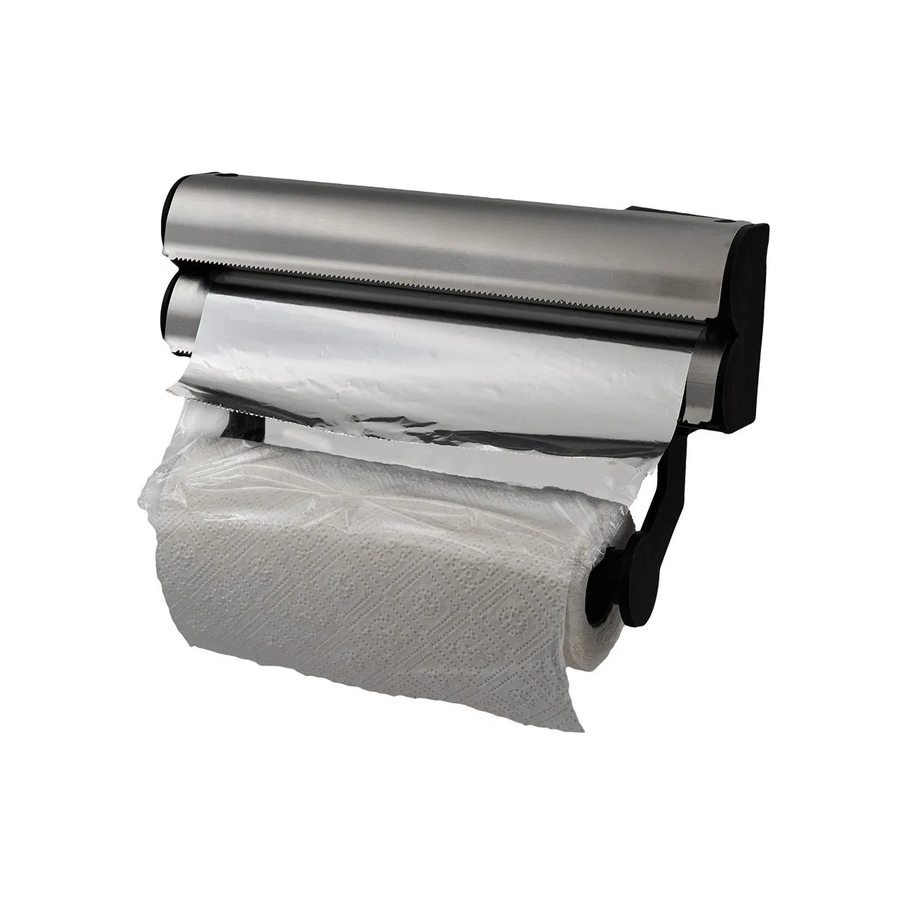 Μεταλλική πολυβάση κουζίνας ανοξείδωτη με πλαστικά ακροφύσια για χαρτί κουζίνας,μεμβράνη και αλουμινόχαρτο.