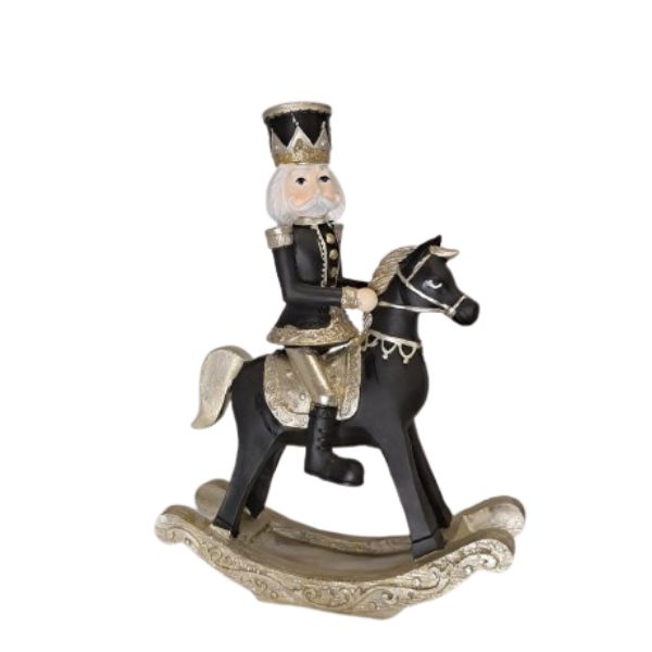 Χριστουγεννιάτικη διακοσμητική φιγούρα καρυοθραύστη πάνω σε κουνιστό άλογο. Διαθέτει κομψό σχεδιασμό σε μαύρες και χρυσές αποχρώσεις, ιδανικό για εορταστικό στολισμό σε κάθε χώρο.