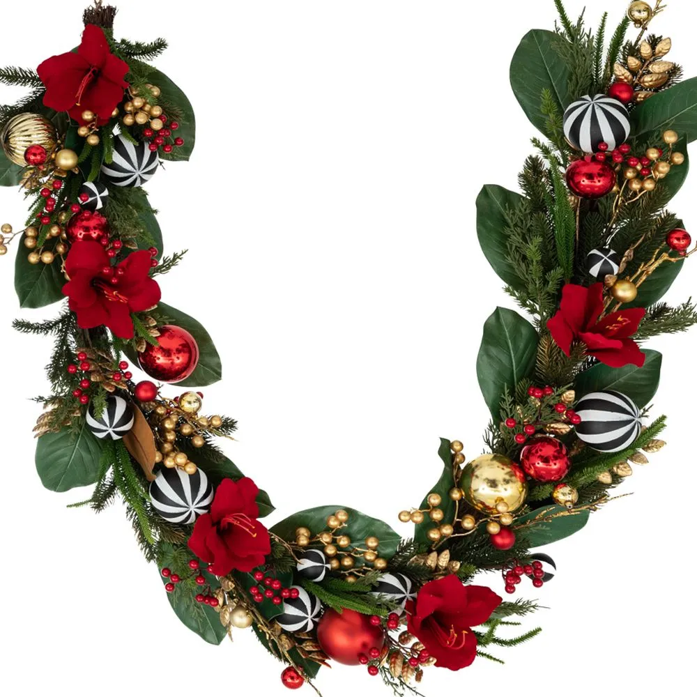 Πλούσια διακοσμητική γιρλάντα διαστάσεων 23x15x183εκ., στολισμένη με κόκκινα τεχνητά άνθη και μπάλες σε κόκκινες, χρυσές και ριγέ αποχρώσεις. Μια ιδιαίτερη σύνθεση που προσθέτει χρώμα και στυλ στον χριστουγεννιάτικο διάκοσμο.