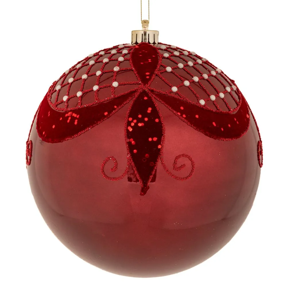 Εντυπωσιακή μπορντό περλέ μπάλα διαμέτρου 25εκ., κατασκευασμένη από ανθεκτικό πλαστικό. Διακοσμημένη με περίτεχνο σχέδιο, προσθέτει μια πινελιά πολυτέλειας και αρχοντιάς στον χριστουγεννιάτικο στολισμό σας.