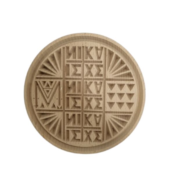 Παραδοσιακή σφραγίδα με βαθύ και ευκρινές ανάγλυφο για το ζύμωμα του προσφόρου. Φέρει την κεντρική παράσταση του Αμνού (ΙΣ ΧΣ ΝΙΚΑ), τη μερίδα της Παναγίας και τα Τάγματα των Αγίων, εξασφαλίζοντας καθαρό και λεπτομερές αποτύπωμα στον ιερό άρτο.
