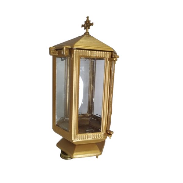 Κλασικό φαναράκι μνήματος εξαγωνικού σχήματος σε χρυσή απόχρωση, με σταυρό στην κορυφή. Διαθέτει γυάλινα τοιχώματα για αποτελεσματική προστασία της φλόγας από τον αέρα και αποτελεί μια διαχρονική και καλαίσθητη επιλογή.