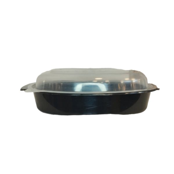 BPP σκληρό μαύρο οβάλ σκεύος 750ml με διάφανο καπάκι, ιδανικό για συσκευασία έτοιμων γευμάτων, take away και delivery. Ανθεκτικό και κατάλληλο για τρόφιμα, προσφέρει ασφαλές κλείσιμο και άψογη παρουσίαση του περιεχομένου. Κατάλληλο για επαγγελματική χρήση στην εστίαση.